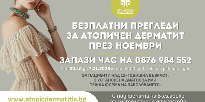 Продължава записването за атопичен дерматит през ноември в Плевен, информират организаторите на инициативата. Записването се осъществява на телефон 0876 984 552, всеки делничен ден от 9 ч. до 17 ч. В инициативата ще се включат водещи дерматолози от осем града на страната – София, Сливен, Стара Загора, Пловдив, Плевен, Варна, Русе и Шумен. Прегледите ще се осъществяват през целия месец ноември, а час може да бъде записан до 7 ноември.