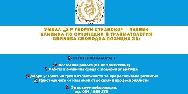 Клиниката по ортопедия и травматология към УМБАЛ „Д-р Г. Странски“ търси рентгенов лаборант с постоянна заетост и отлични условия на труд.