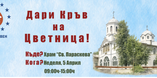 В Плевен на Цветница ще се проведе традиционна кампания за безвъзмездно и доброволно кръводаряване, организирана от Районния център по трансфузионна хематология. Инициативата ще се състои на 5 април (неделя) и ще даде възможност на желаещите да дарят кръв между 09:00 и 15:00 часа.