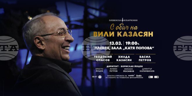 Премиерата на най-новия проект на Плевенската филхармония „С обич на Вили Казасян“ ще се състои в Плевен на 13 март в концертна зала „Катя Попова“. Информацията е на БТА (Българска телеграфна агенция), като новината е разпространена по данни от пресцентъра на общинската администрация.