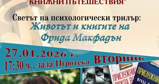 Читателският клуб „Книжни пътешествия“, функциониращ към Регионална библиотека „Христо Смирненски“ в Плевен, подготвя третата си среща, която ще се проведе на 27 януари в зала „Игротека“. Събитието ще бъде посветено на известната авторка на криминални и психологически трилъри Фрида Макфадън. Информацията е съобщена от Елвира Цветанова, представител на отдела за връзки с обществеността към културния институт. Новината бе разпространена от Българска Телеграфна агенция (БТА).